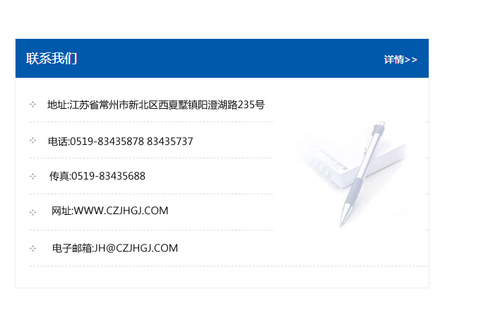 地址:常州市新北區友邦商務大廈1幢16、17層  電話:0519-85101652  傳真:0519-85112595  郵編:213022  網址:www_cz-jiayue_cn.ziboyinxiang.com  郵箱:xiajifengaa@163.com